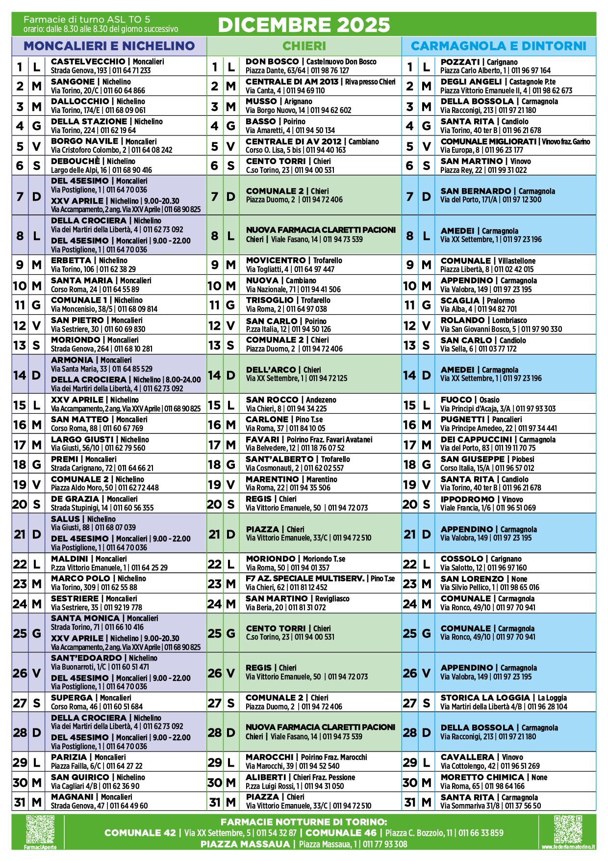 Come sempre la colonna centrale è quella del distretto di Chieri, i turni comprendono i turni di tutti le festività di Natale